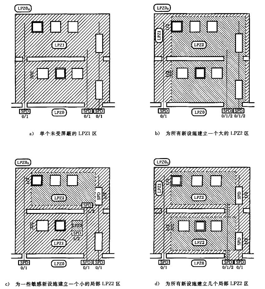 ——圖1b)中用一個(gè)LPZ2區(qū)容納下所有新設(shè)施。對(duì)由LPZ0直接過渡到LPZ2區(qū)的界面處的SPD有更高要求。