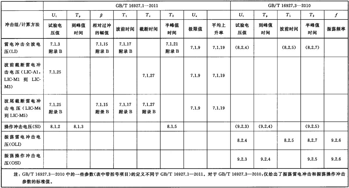 表A.1 雷電沖擊全波(LI)參數(shù)的標(biāo)準(zhǔn)值及其可接受的限值