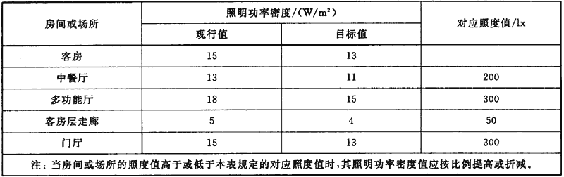 6.3 賓館、飯店建筑照明功率密度值應(yīng)不大于表4的規(guī)定。