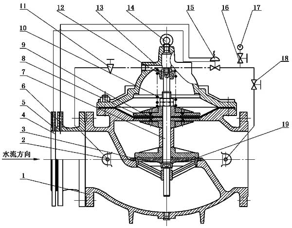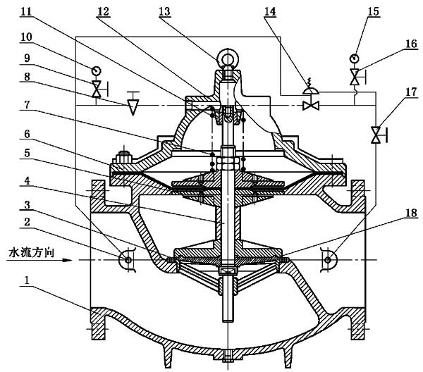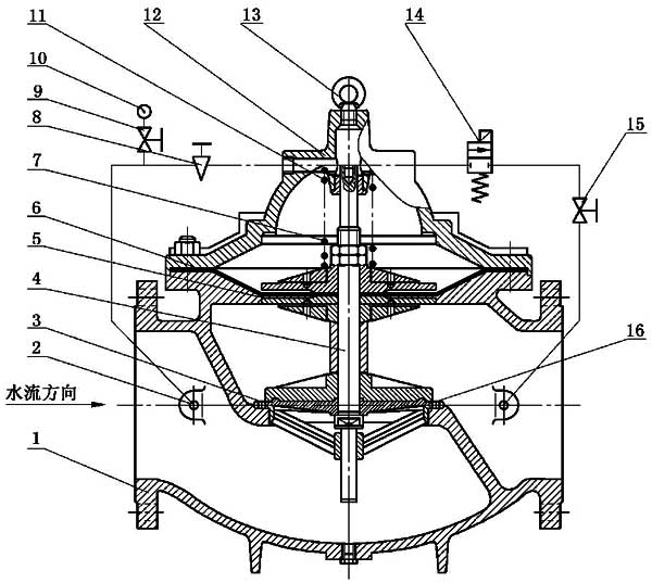 利用調(diào)節(jié)閥和單向閥導(dǎo)流,借助水作用力開(kāi)啟或關(guān)閉閥門。
