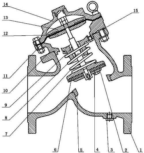 利用泄壓先導(dǎo)閥感應(yīng)閥門上游壓力,并控制主閥,使主閥自動(dòng)排出部分管線水穩(wěn)定閥前管道的設(shè)定壓力,當(dāng)壓力恢復(fù)到設(shè)定壓力以下時(shí),主閥自動(dòng)關(guān)閉。閥門的泄壓或持壓在一定范圍內(nèi)可調(diào)節(jié)。