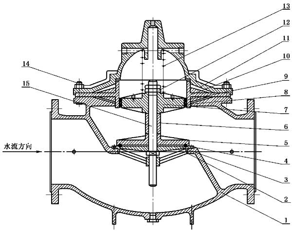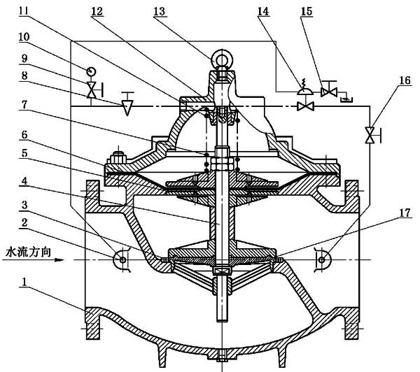 利用壓差先導(dǎo)閥感應(yīng)閥門上下游壓差,并控制主閥的開(kāi)度。壓差在一定范圍內(nèi)可調(diào)節(jié)。