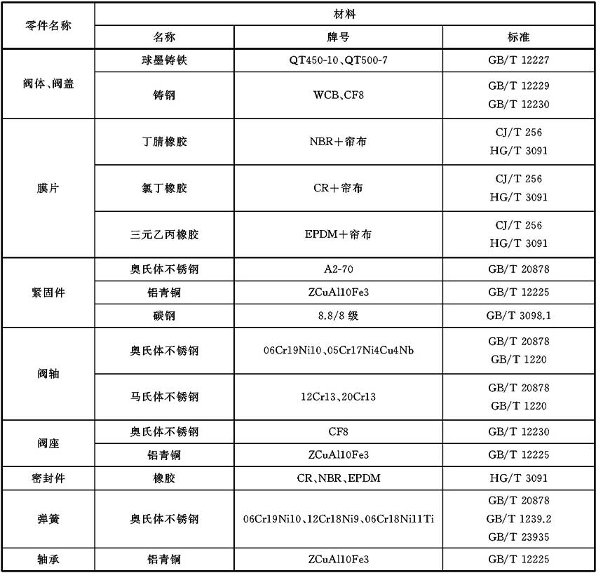 閥體、閥蓋、閥軸、閥座等主要零件材料應(yīng)符合表2的規(guī)定,也可選用機(jī)械性能相當(dāng)或高于表2中材料性能的其他材料。