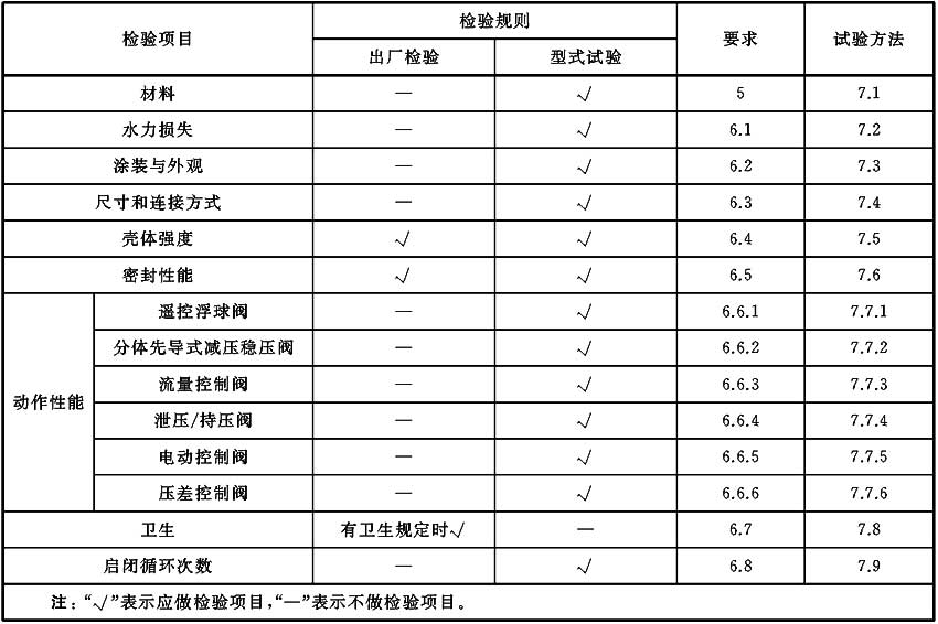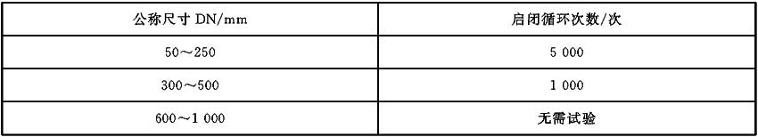水力控制閥的主閥啟閉循環(huán)次數(shù)不應(yīng)低于表9的規(guī)定。水力控制閥主閥啟閉循環(huán)試驗(yàn)后,閥門承壓件任何部位不應(yīng)有損壞性磨損、永久變形;密封試驗(yàn)時(shí),試驗(yàn)介質(zhì)為液體,試驗(yàn)壓力、持壓時(shí)間和允許的泄漏量應(yīng)符合GB/T 13927的規(guī)定。