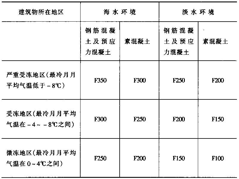 3.0.13 護(hù)岸工程的混凝土和鋼筋混凝土構(gòu)件,當(dāng)無抗凍要求時(shí),混凝土強(qiáng)度等級不應(yīng)低于表3.0.13-1的規(guī)定值;當(dāng)有抗凍要求時(shí),混凝土抗凍等級不應(yīng)低于表3.0.13-2的規(guī)定值。