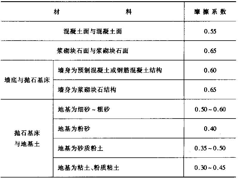 ③墻身為預(yù)制混凝土結(jié)構(gòu),其與拋石基床間摩擦系數(shù),對直立式護(hù)岸,當(dāng)作用于基床面平均壓強(qiáng)大于300kPa時(shí),或回淤影響明顯的港區(qū),基床面難以避免落淤時(shí),可適當(dāng)降低。