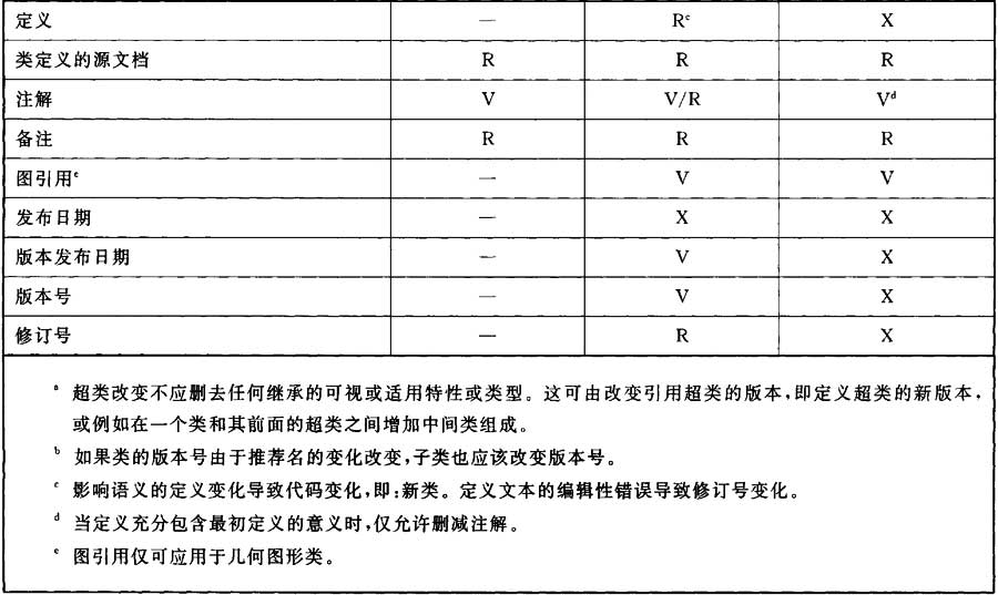 表E.2給出更新工作(增加、修改、刪減類的某些屬性)怎樣影響給出類的版本號(hào)(V)或修訂號(hào)(R)的概況。有時(shí),表示的工作沒(méi)有意義,以及語(yǔ)法上限制在公共字典模式(—),或者完全禁止(X)。該表不反映創(chuàng)建項(xiàng)目類。修改意味著修改屬性值。