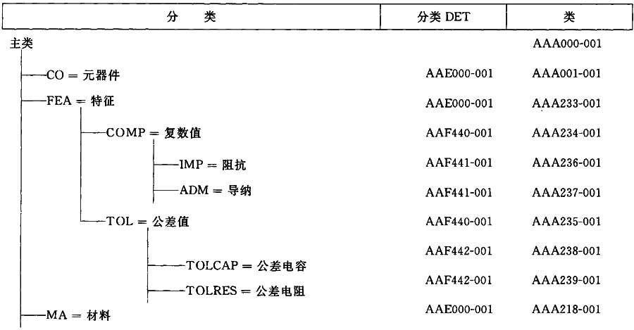 分類DET是具有數(shù)據(jù)類型“非定量代碼”的特性DET,因此,具有由包含至少兩個(gè)項(xiàng)目的值列表組成的值域。當(dāng)與類關(guān)聯(lián)時(shí),其基本功能是提供該類的子類列表。因此,在IEC字典內(nèi),除分類樹(shù)末端外的所有類都有該類的適用特性之一的分類DET。在STEP物理文件中,類及其相關(guān)的分類DET(存在時(shí))之間的鏈接由第十四字段,TIEM_CLASS實(shí)體中的SUB_CLASS_PROPERTIES構(gòu)成。