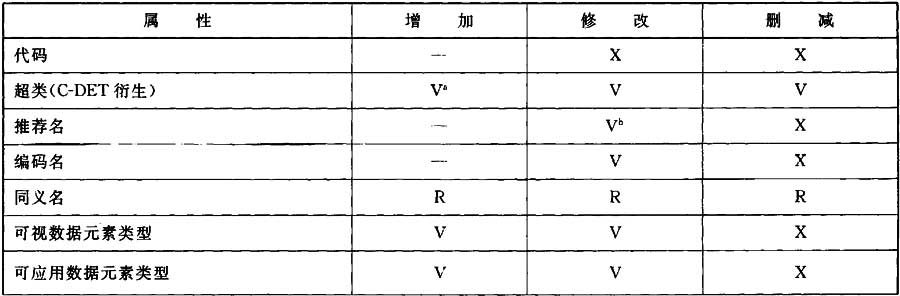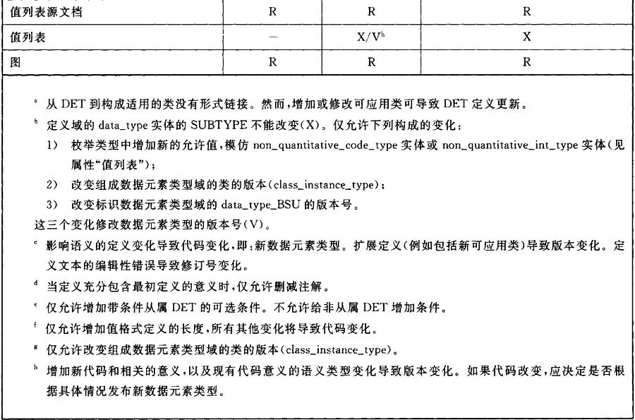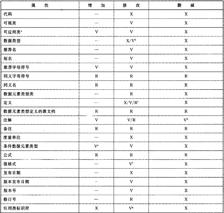 提供了兩個(gè)概念來(lái)標(biāo)記數(shù)據(jù)元素類型的更新工作。版本號(hào)是數(shù)據(jù)元素類型的標(biāo)識(shí)部分,而修訂號(hào)是數(shù)據(jù)元素類型的管理控制部分。表E.1給出更新工作(增加、修改、刪減數(shù)據(jù)元素類型的每個(gè)屬性)怎樣影響給出數(shù)據(jù)元素類型的版本號(hào)(V)或修訂號(hào)(R)的概況。有時(shí),表示的工作對(duì)概念層沒(méi)有意義,以及語(yǔ)法上限制在公共字典模式(—),或者完全禁止(X)。該表不反映創(chuàng)建數(shù)據(jù)元素類型。修改意味著修改屬性值。