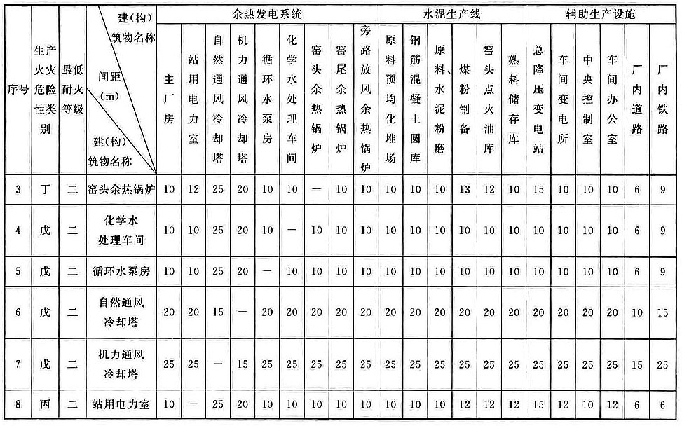 附錄A 余熱發(fā)電和水泥生產(chǎn)線建(構(gòu))筑物的火災(zāi)危險性類別、耐火等級及最小防火間距