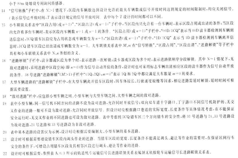 本次修訂的主要技術內(nèi)容是:增加無軌膠輪車運輸信號設計的內(nèi)容,將單軌吊車運輸信號設計納入本規(guī)范。增加區(qū)段設計、聯(lián)鎖設計的基本規(guī)定。增加對聯(lián)鎖設備與測控分站的規(guī)定。增加運輸信號平面布置圖與聯(lián)鎖關系表的設計內(nèi)容。對原國家標準《煤礦井下機車運輸信號設計規(guī)范》GB50388-2006中的主要技術內(nèi)容進行了補充、完善和必要的修改。
