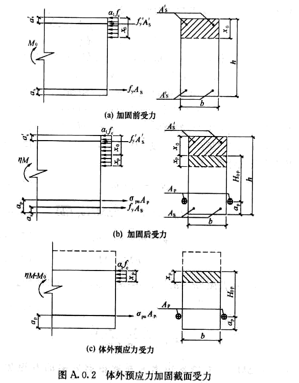 A.0.2 矩形截面梁體外預(yù)應(yīng)力筋拉力設(shè)計(jì)值可根據(jù)矩形梁的截面寬度、有效高度和承受彎矩設(shè)計(jì)值,按下列公式計(jì)算: