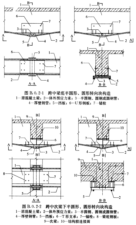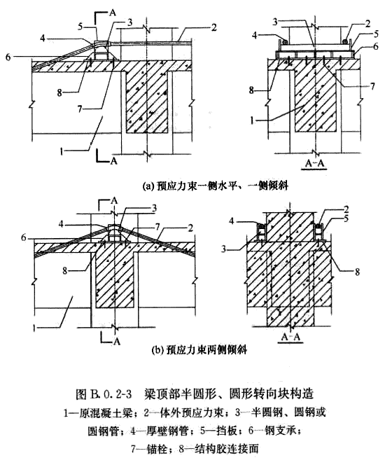 B.0.2 當(dāng)轉(zhuǎn)向塊轉(zhuǎn)向采用半圓鋼、圓鋼或圓鋼管時(shí),預(yù)應(yīng)力筋在轉(zhuǎn)向塊處宜采用厚壁鋼套管,并宜通過(guò)擋板固定預(yù)應(yīng)力束位置,轉(zhuǎn)向塊構(gòu)造及與加固梁的連接可采用下列形式: