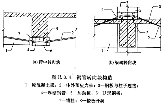 2 當(dāng)轉(zhuǎn)向塊安裝在加固梁頂柱子兩側(cè)時(shí),宜采用鋼板利用錨栓和結(jié)構(gòu)膠與加固梁頂和柱子連接固定,鋼管與柱子側(cè)面鋼板焊接固定,并通過(guò)豎向加勁加強(qiáng)鋼管與豎向鋼板的連接[圖B.0.4(b)],預(yù)應(yīng)力束穿過(guò)樓板時(shí)應(yīng)在樓板開(kāi)洞,張拉后封堵。