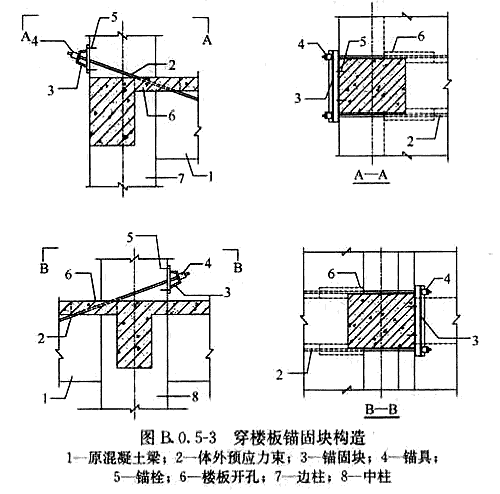 3 當(dāng)加固梁有邊梁或在跨中錨固有橫向梁時(shí),也可在樓板開(kāi)孔,體外束穿過(guò)樓板錨固,錨固塊通過(guò)鋼板箍固定在上層柱底部(圖B.0.5-3),這種方式應(yīng)注意預(yù)加力對(duì)柱底剪力的影響。