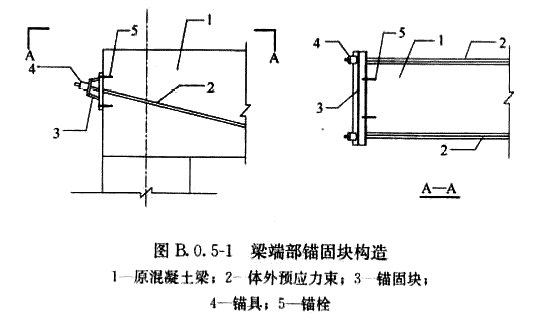 2 當(dāng)加固梁端部有邊梁時(shí),可在邊梁上鉆孔,體外束穿過(guò)邊梁錨固在加固梁中性軸稍偏上的位置(圖B.0.5-2);