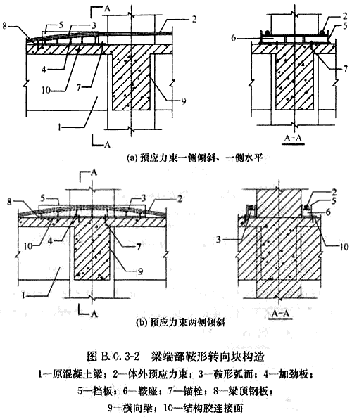 B.0.3 當(dāng)轉(zhuǎn)向塊為鞍形時(shí),預(yù)應(yīng)力束套管可在鞍形轉(zhuǎn)向塊上平順通過(guò),并宜通過(guò)擋板固定預(yù)應(yīng)力束位置,轉(zhuǎn)向塊構(gòu)造及與加固梁的連接可采用下列形式: