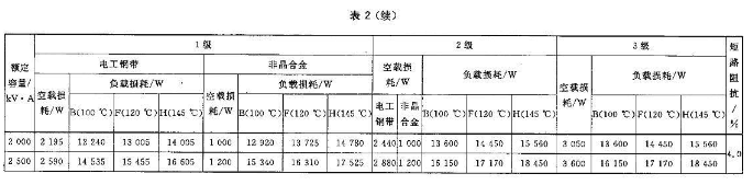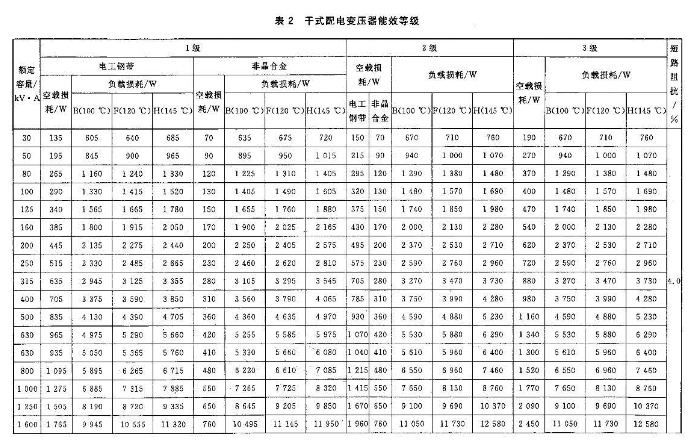 油浸式配電變壓器的空載損耗和負(fù)載損耗值均應(yīng)不高于表1中2級(jí)的規(guī)定。干式配電變壓器的空載損耗和負(fù)載損耗值均應(yīng)不高于表2中2級(jí)的規(guī)定。