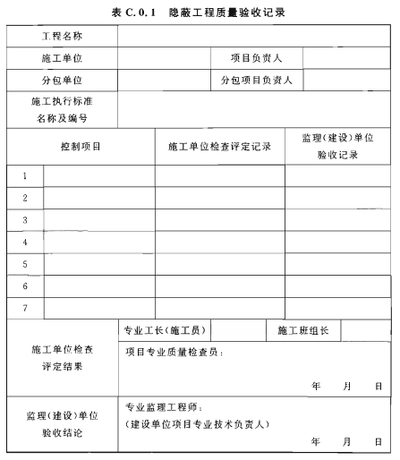 C.0.1 隱蔽工程質(zhì)量驗收記錄應符合表C.0.1的規(guī)定。