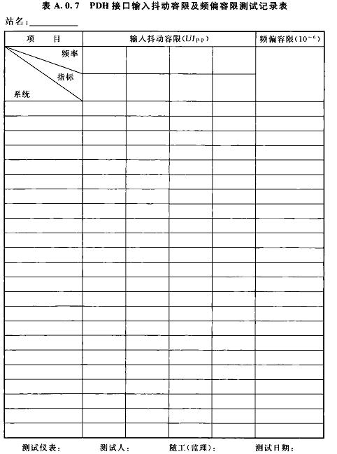 A.0.7PDH接口輸入抖動(dòng)容限及頻偏容限測(cè)試記錄可按表A.0.7選用。