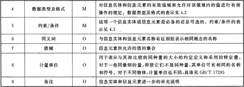 以摘要形式對信息實體和信息元素的中文名稱、英文名稱、說明、數(shù)據(jù)類型及格式、約束/條件、同義詞、值域、計量單位和備注等九個屬性進行完整說明。