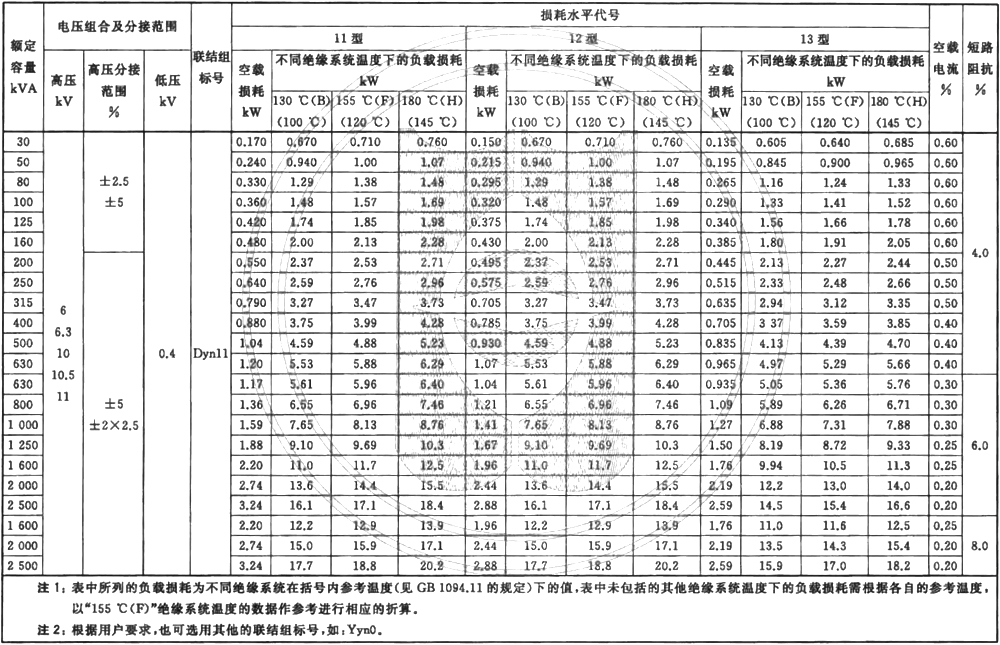自冷變壓器的額定容量、電壓組合、聯(lián)結(jié)組標(biāo)號(hào)、空載損耗、負(fù)載損耗、空載電流及短路阻抗應(yīng)符合表1的規(guī)定。