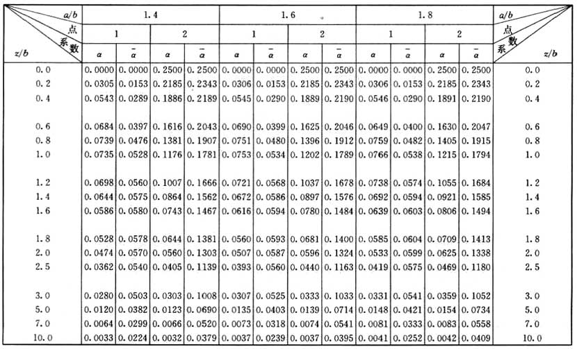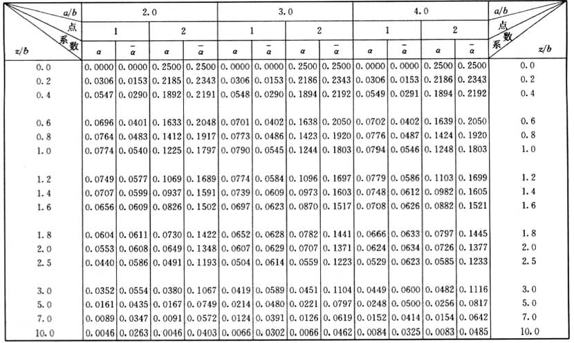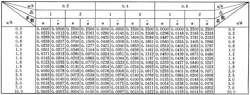 注:a——矩形均布荷載長度(m);b——矩形均布荷載寬度(m);z——計算點離基礎底面或樁端平面垂直距離(m)。
