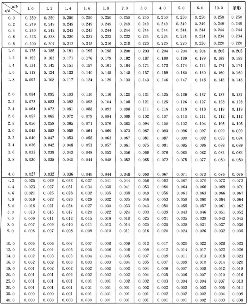 表C.0.1-1 矩形面積上均布荷載作用下角點附加應力系數(shù)α