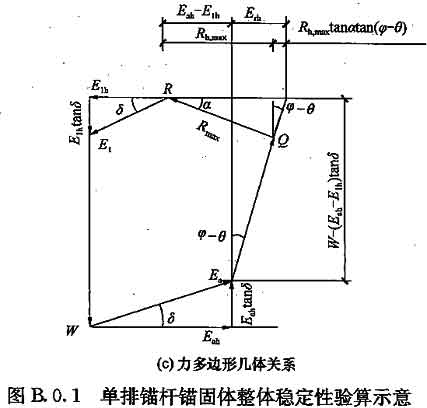 錨桿最大拉力的水平分為Rh,max也可根據(jù)圖B.0.1(c)所示的力平衡關(guān)系按下列公式求得(砂性土層時(shí),c=0):