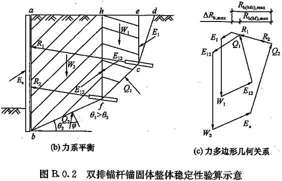 B.0.2 雙排錨桿支護(hù)的整體穩(wěn)定性驗(yàn)算可采用Kranz方法(圖B.0.2),上排錨桿錨固體在下排錨桿錨固體滑動(dòng)楔體的外側(cè),滑動(dòng)面bc的傾角比下排錨桿滑動(dòng)面bf的傾角大(θ1>θ2)。此時(shí)整體穩(wěn)定性安全系數(shù)可按下列公式計(jì)算: