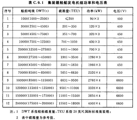 C.0.1集裝箱船舶發(fā)電機(jī)組功率和電壓可按表C.0.1確定。