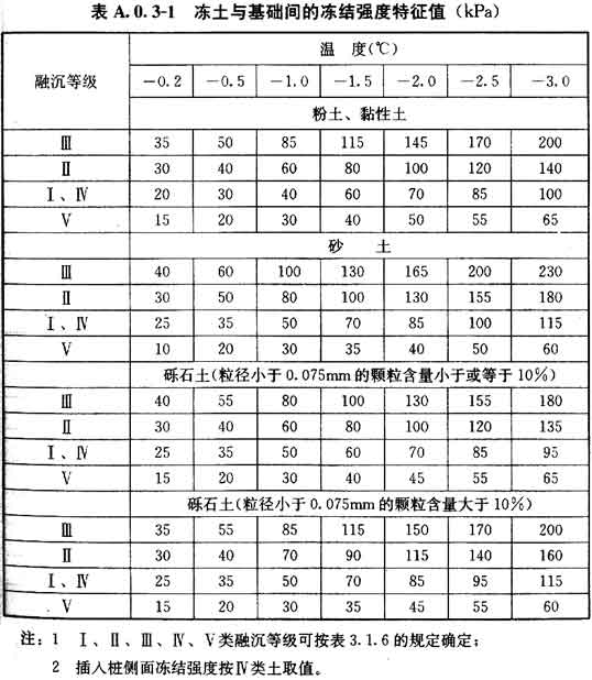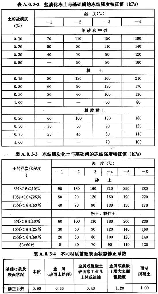 表A.0.3-1~表A.0.3-3可用于混凝土或鋼筋混凝土基礎(chǔ)。其他材質(zhì)的基礎(chǔ)與凍土間的凍結(jié)強度,應(yīng)按表值進行修正,其修正系數(shù)應(yīng)符合表A.0.3-4的規(guī)定。