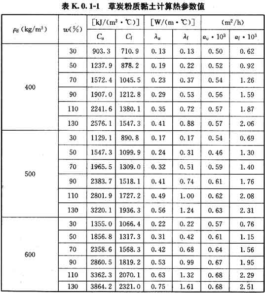 K.0.1 根據(jù)土的類別、天然含水率及干密度測定數(shù)值,凍土和未凍土的容積熱容量、導(dǎo)熱系數(shù)和導(dǎo)溫系數(shù)可分別按表K.0.1-1~表K.0.1-4取值。大含水(冰)率土的導(dǎo)熱系數(shù)在無實測資料時可按表K.0.1-5取值。
