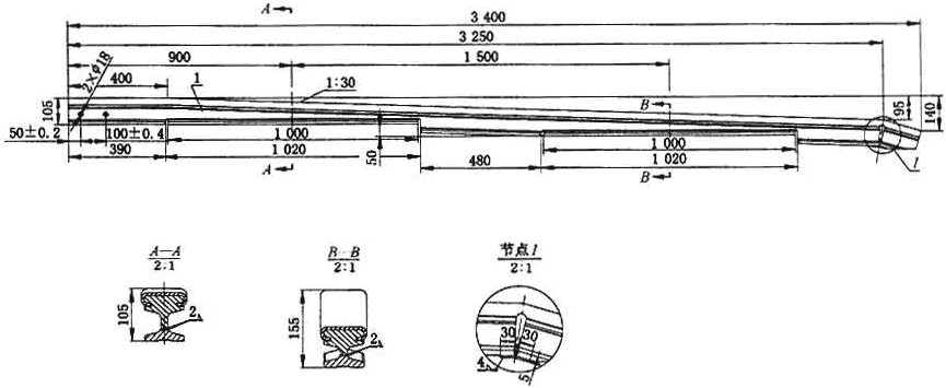 端部彎頭分高速和低速兩種,高速端部彎頭適用于正線,低速端部彎頭適用于車場(chǎng)線,外形及主要尺寸見圖5(高速端部彎頭參考示例圖)和圖6(低速端部彎頭參考示例圖)。