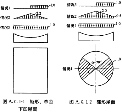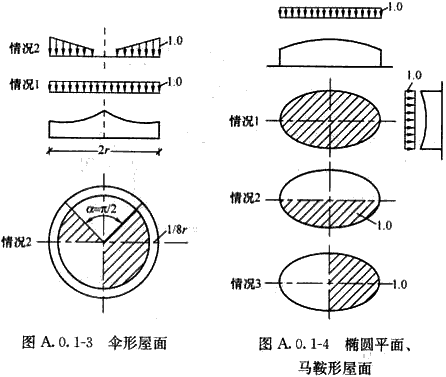 A. 0.1 矩形、單曲下凹屋面,碟形屋面,傘形屋面,橢圓平面、馬鞍形屋面的雪荷載積雪分布系數(shù)宜分別按圖A. 0.1-1~圖A.0.1-4采用。