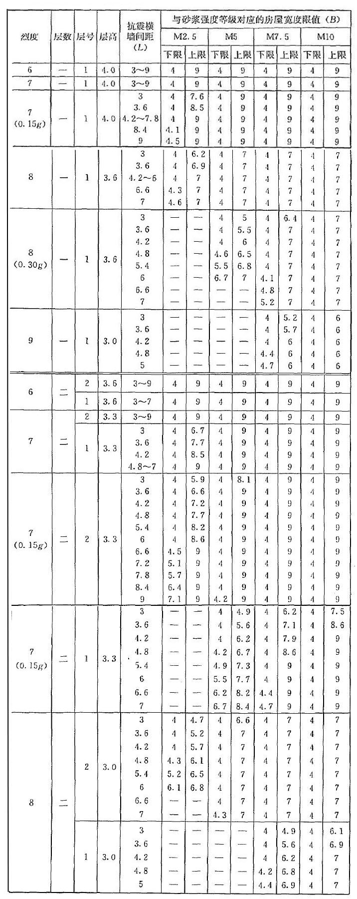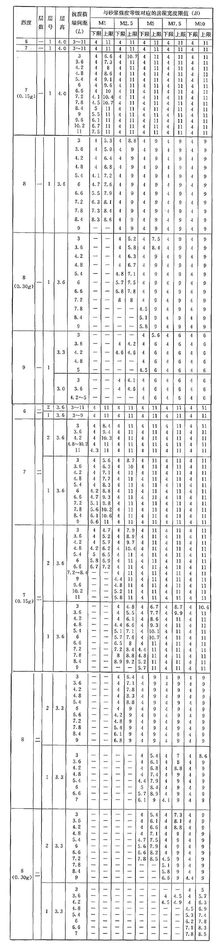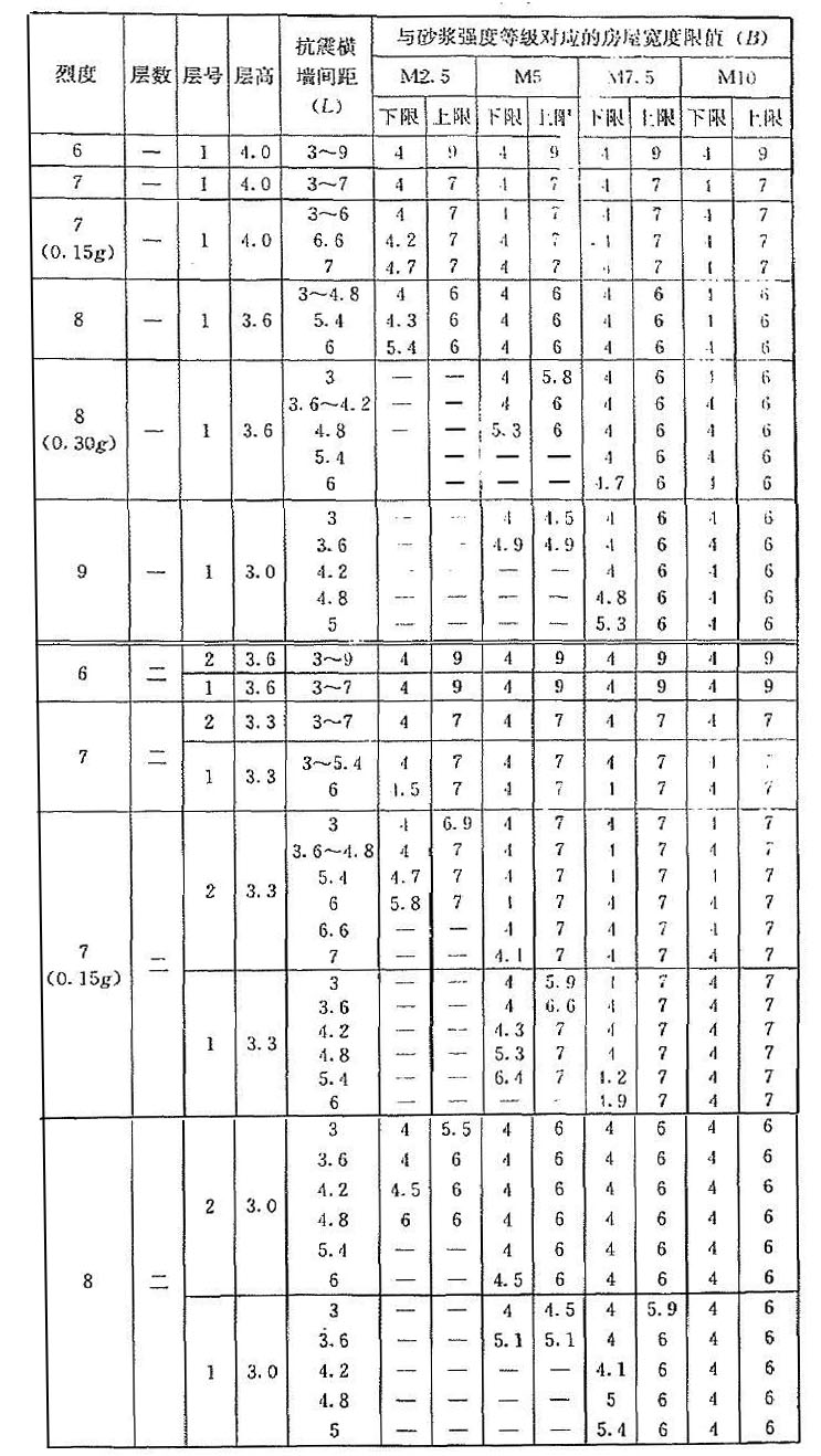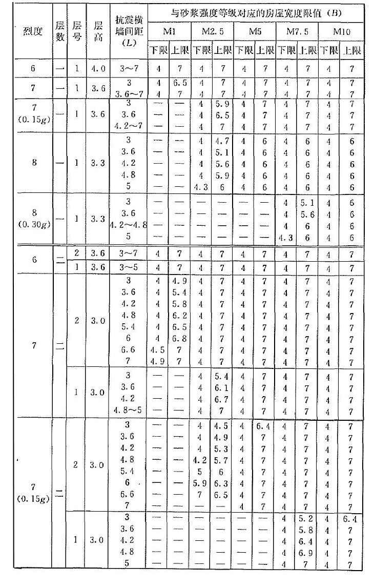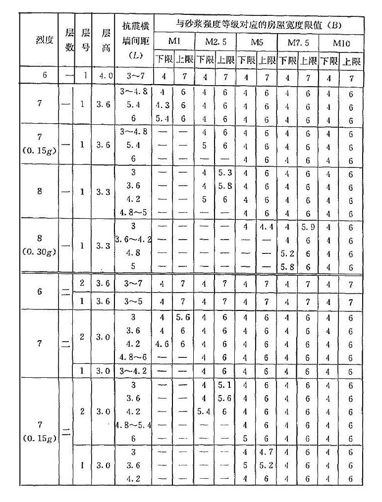 | 烈度 | 層數(shù) | 層號 | 層高 | 抗震橫墻間距(L) | 與砂漿強度等級對應(yīng)的房屋寬度限值(B) | |||||||||