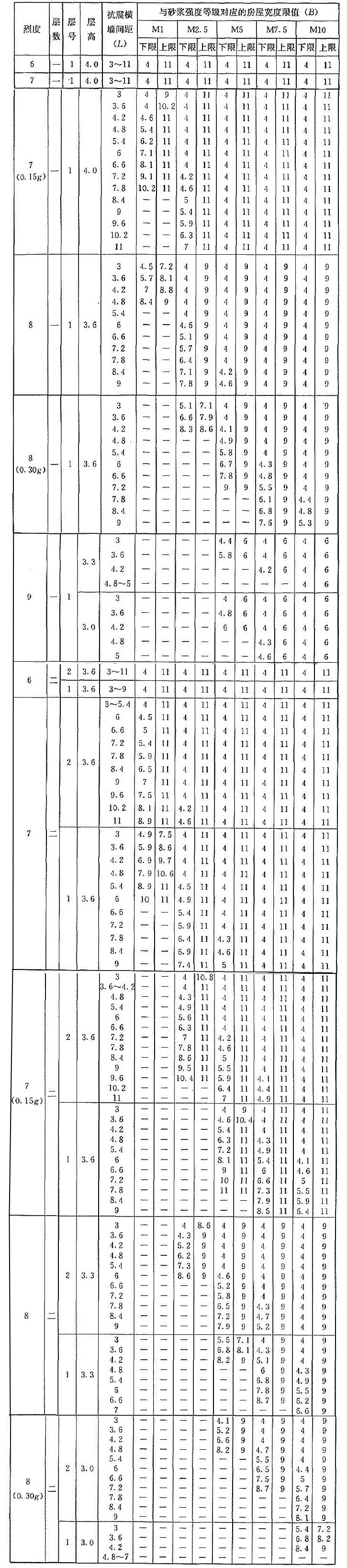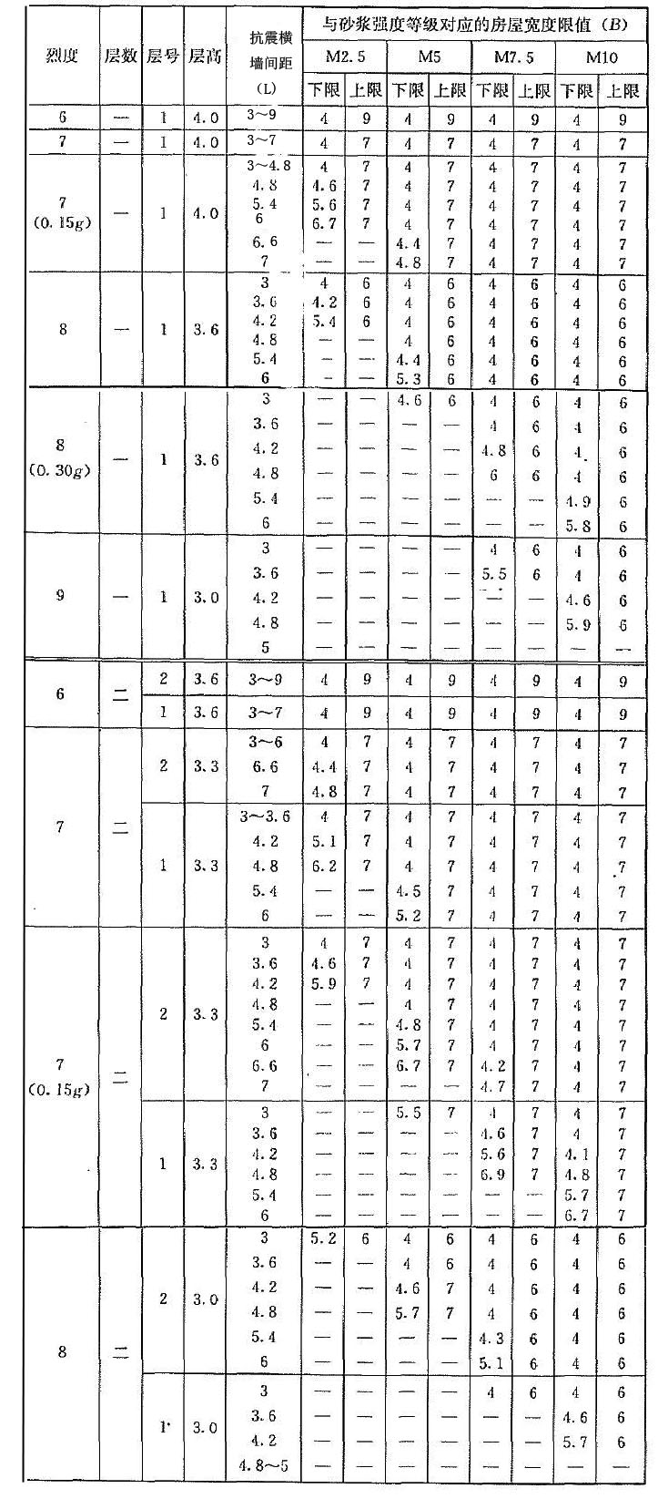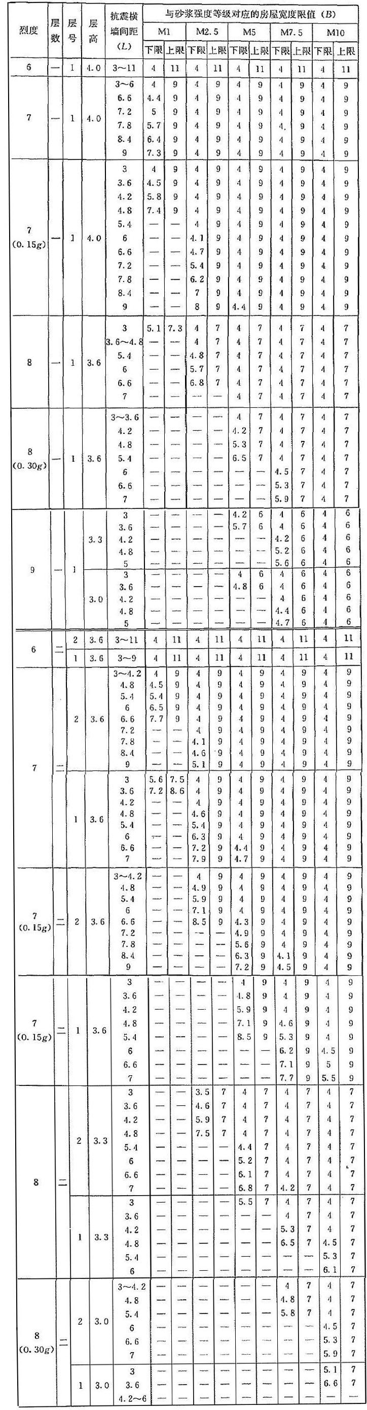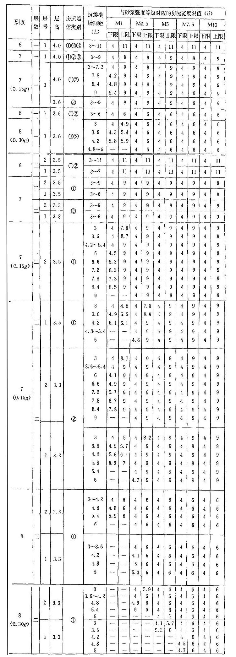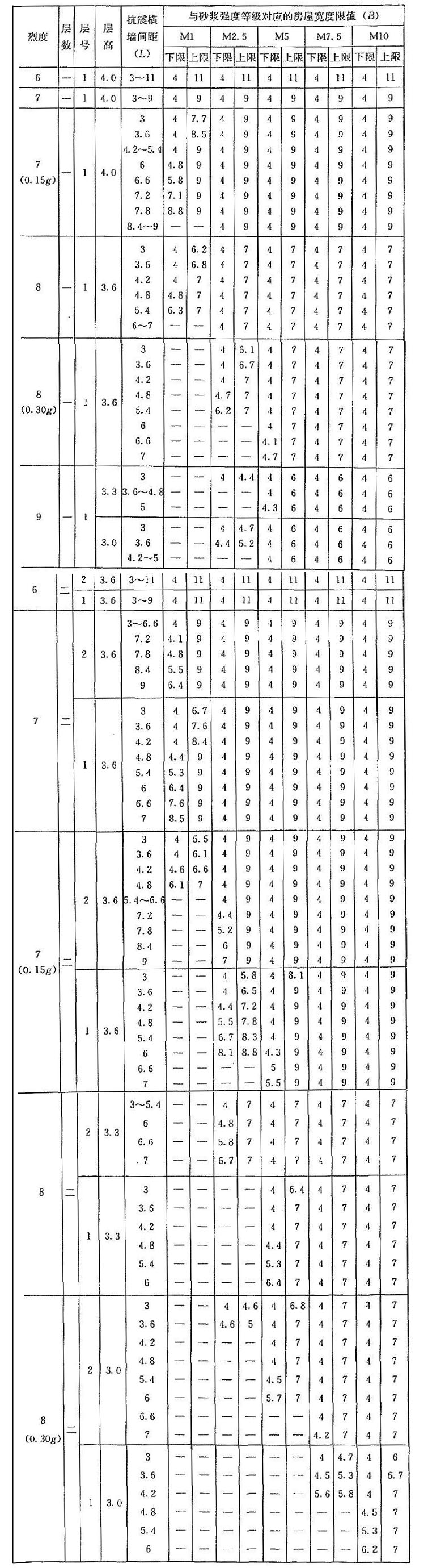 | 烈度 | 層數(shù) | 層號 | 層高 | 抗震橫墻間距(L) | 與砂漿強度等級對應(yīng)的房屋寬度限值(B) | |||||||||