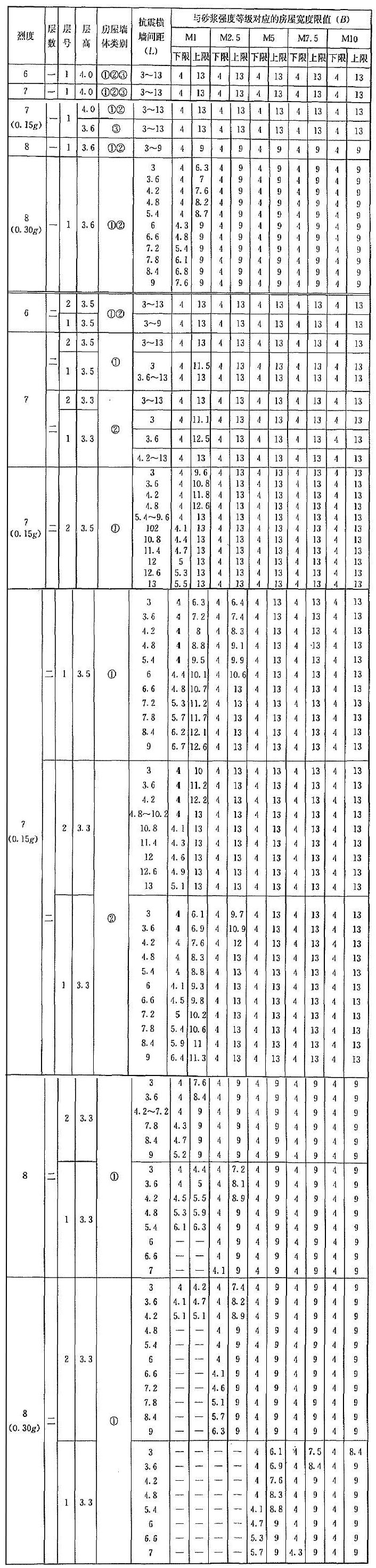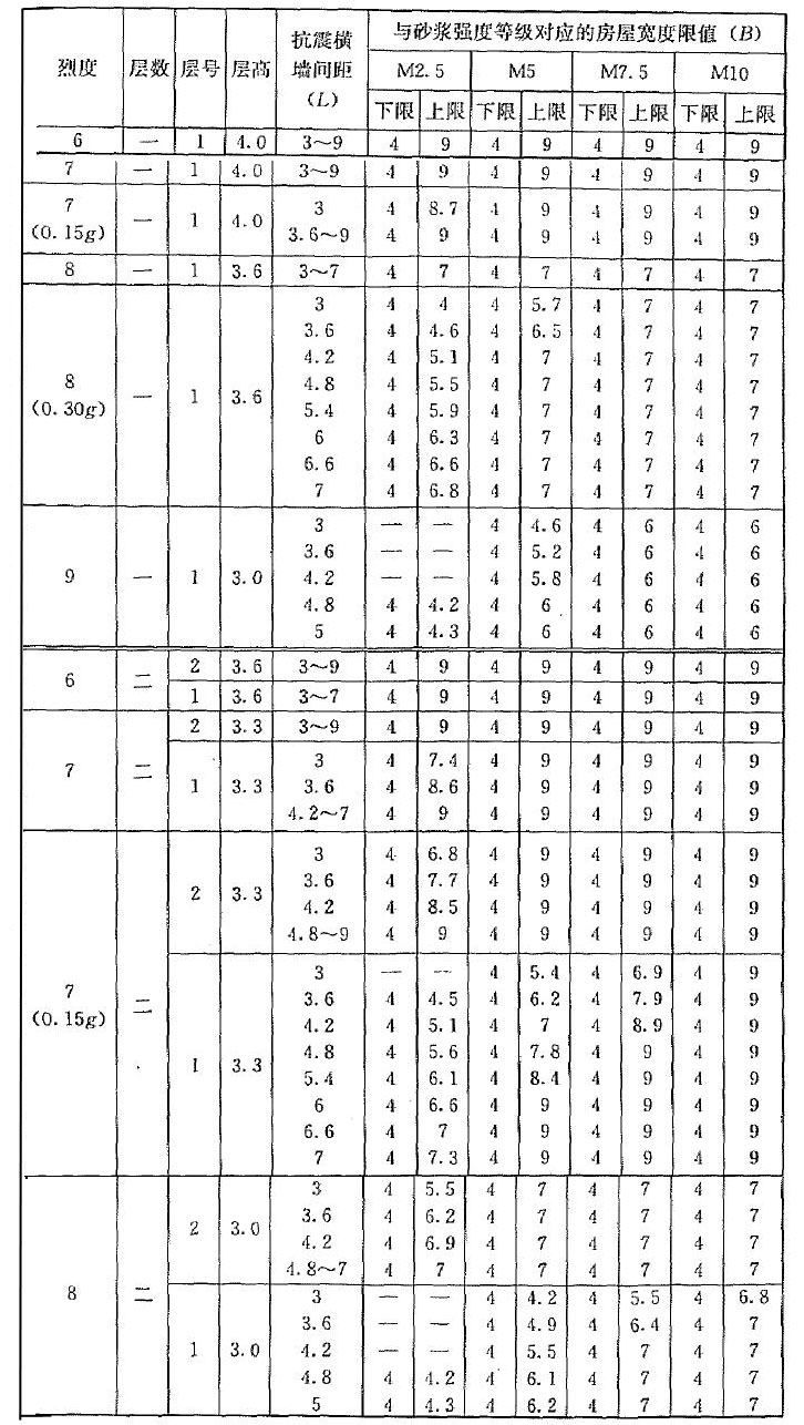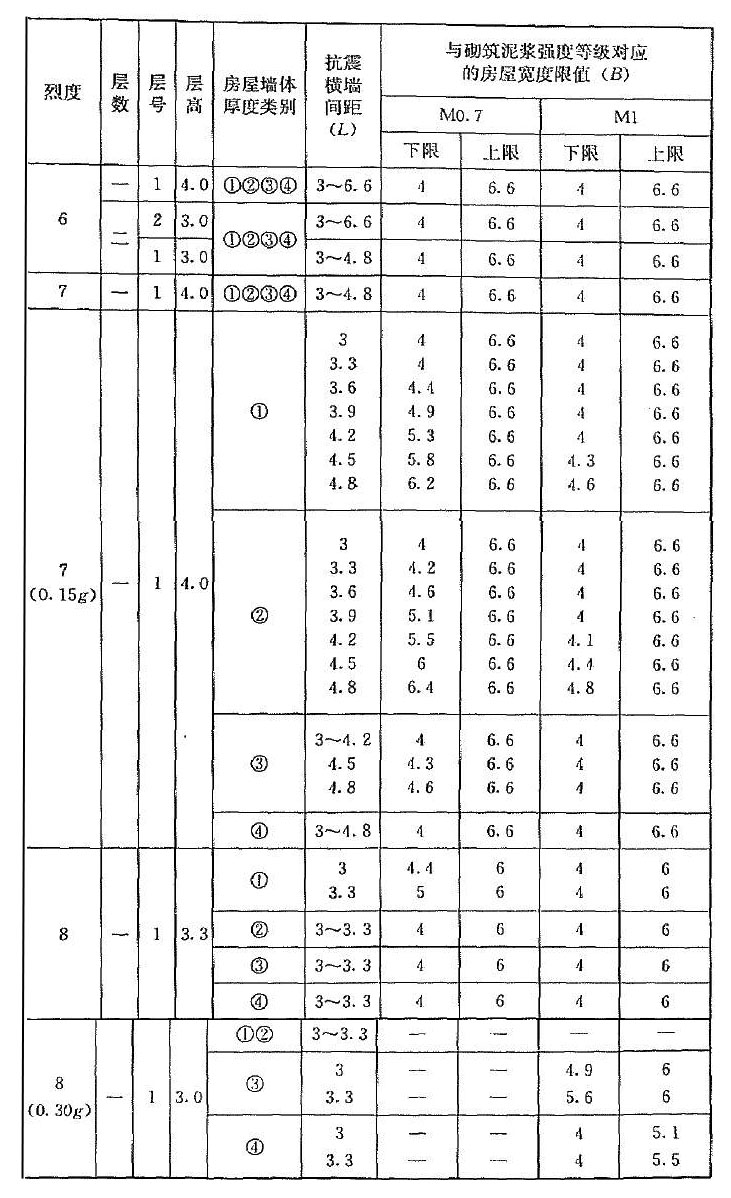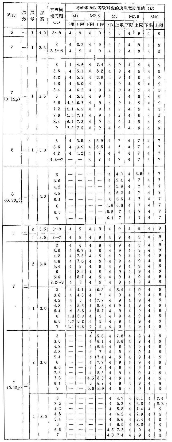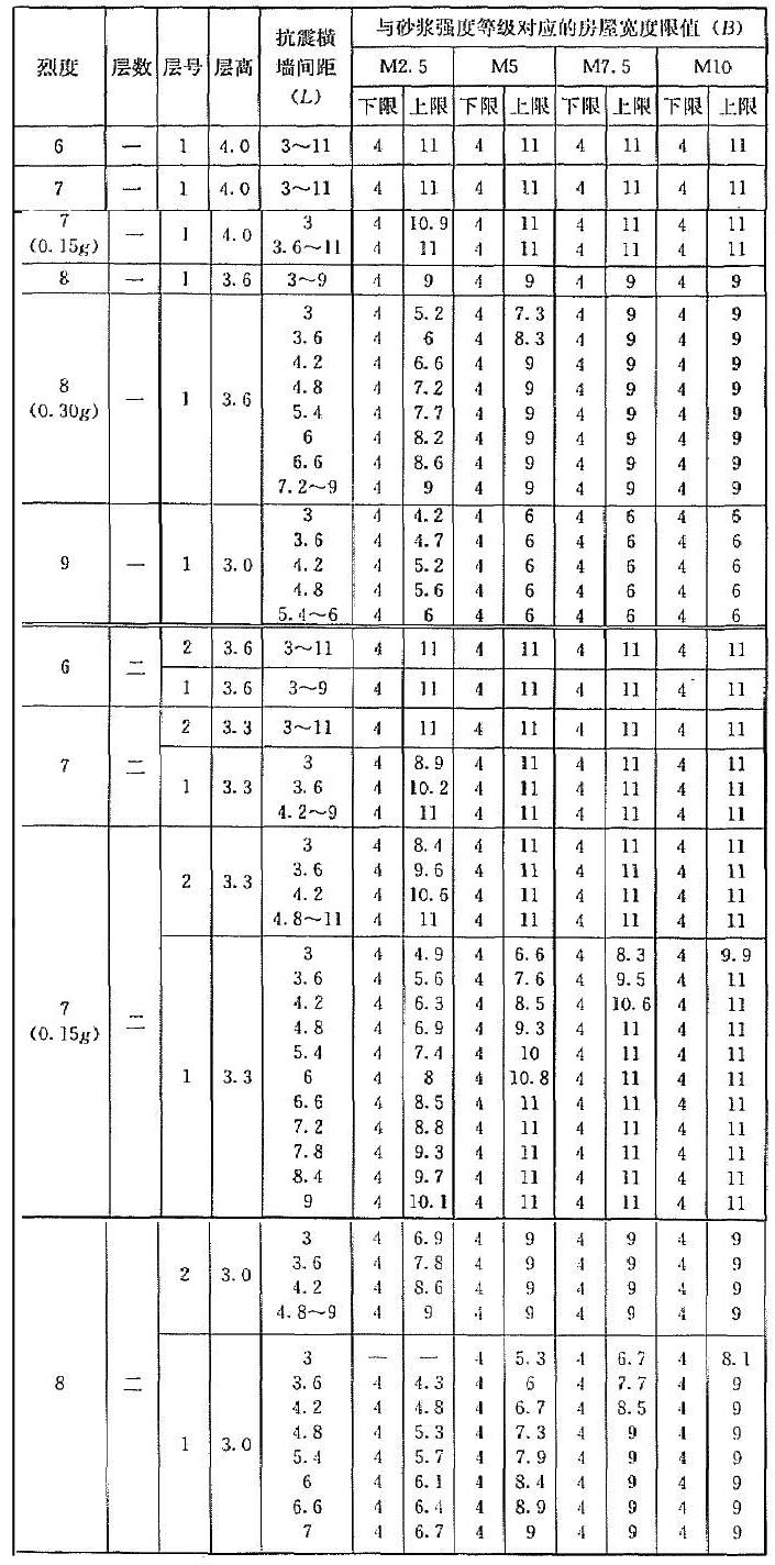 | 烈度 | 層數(shù) | 層號 | 層高 | 抗震橫墻間距(L) | 與砂漿強度等級對應(yīng)的房屋寬度限值(B) | |||||||||