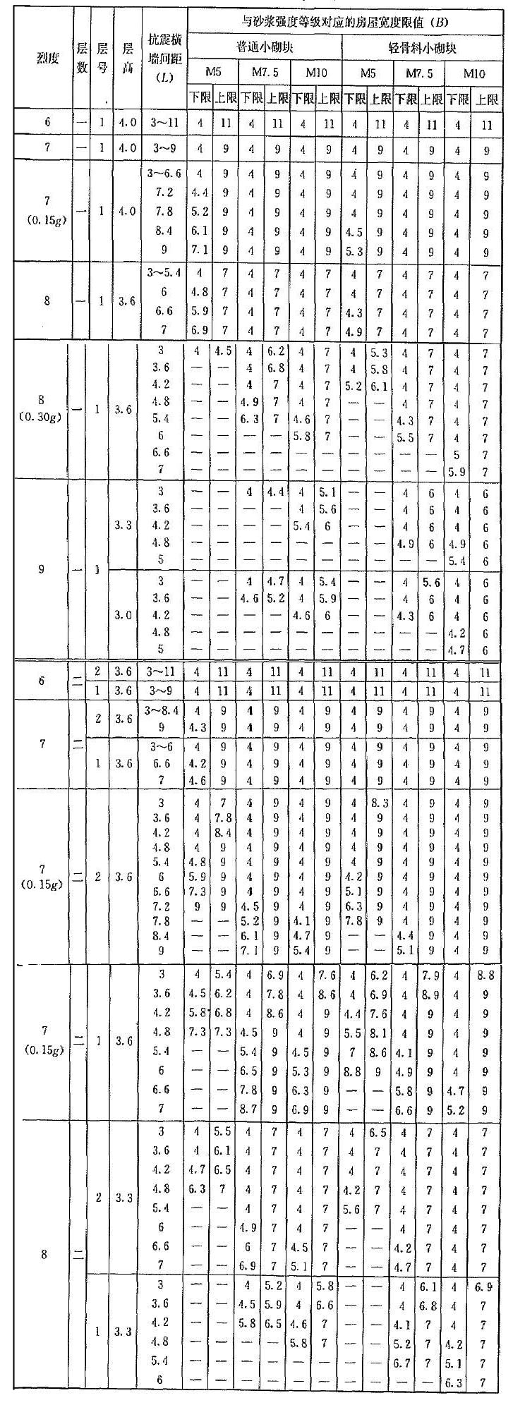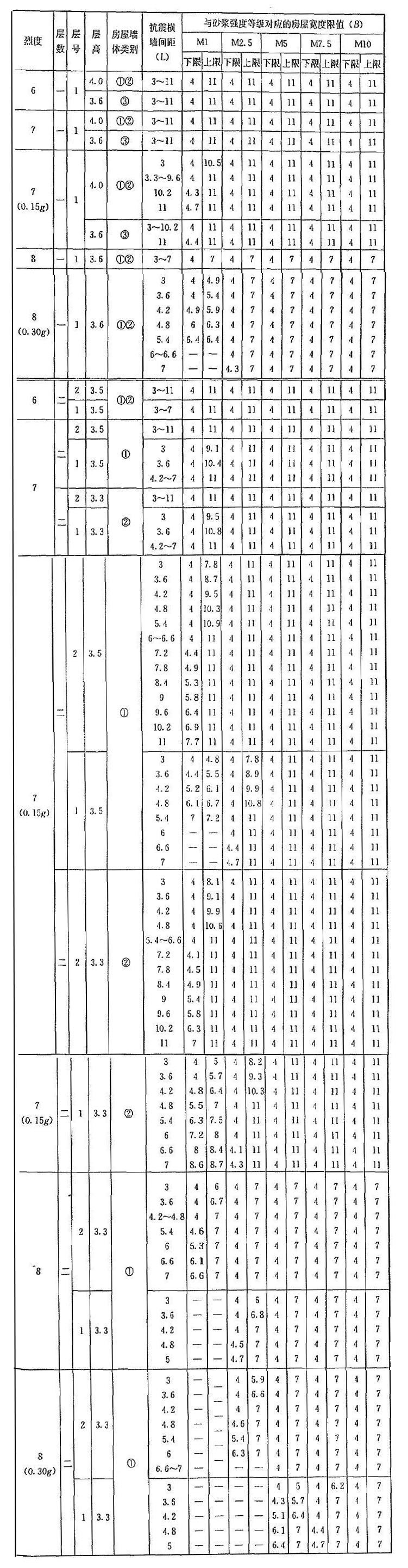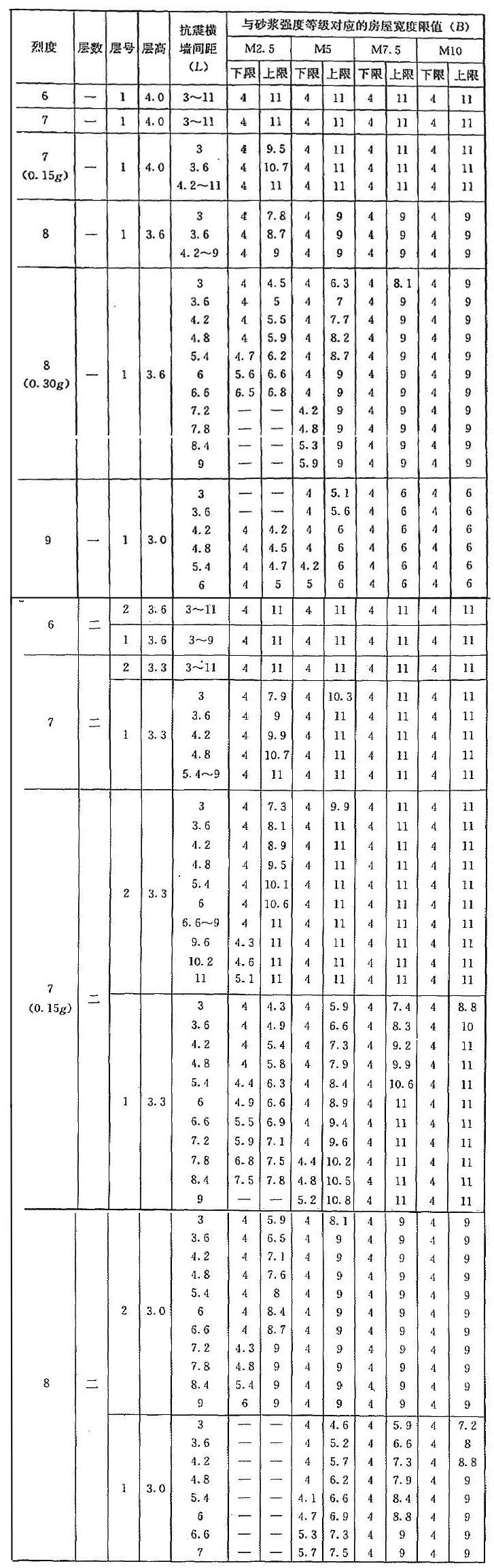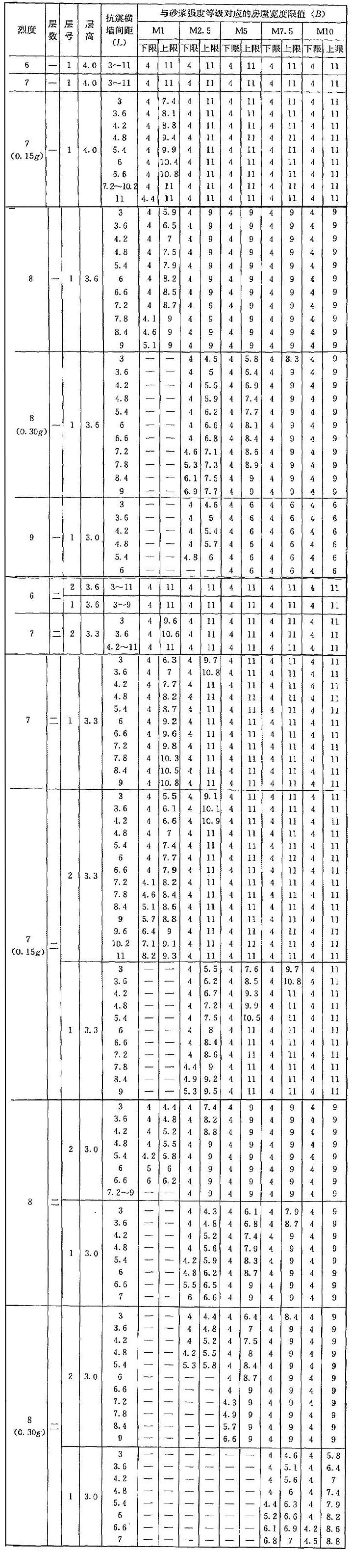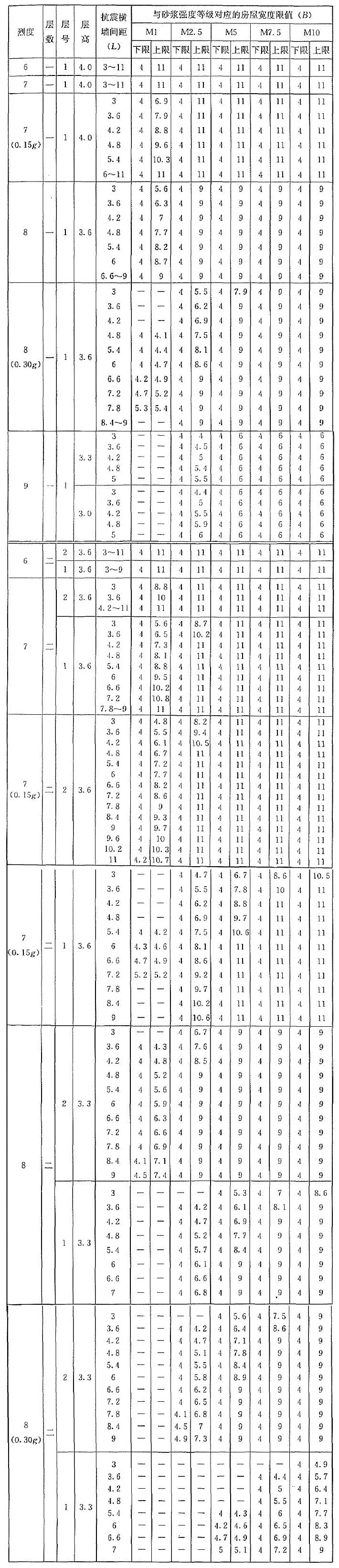 | 烈度 | 層數(shù) | 層號 | 層高 | 抗震橫墻間距(L) | 與砂漿強度等級對應(yīng)的房屋寬度限值(B) | |||||||||