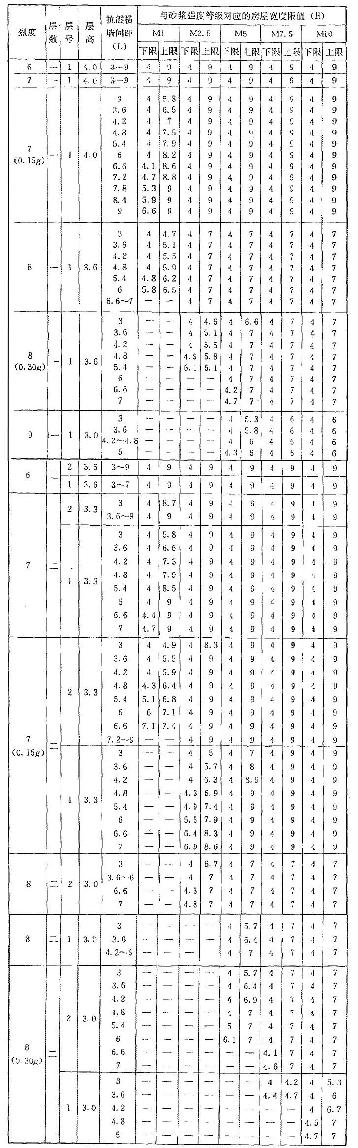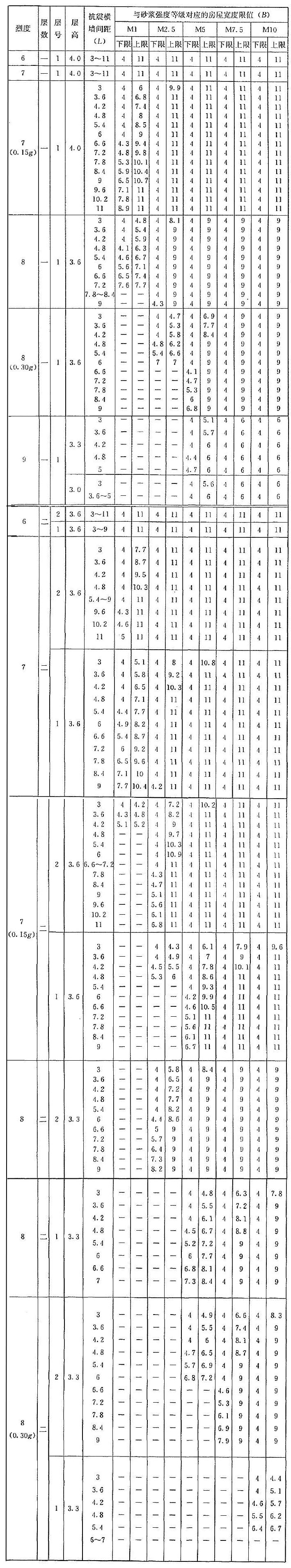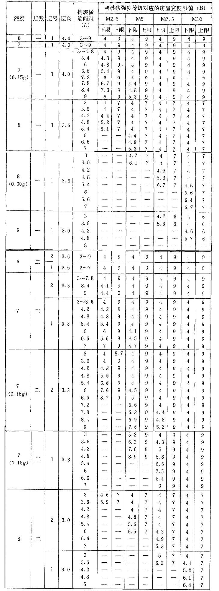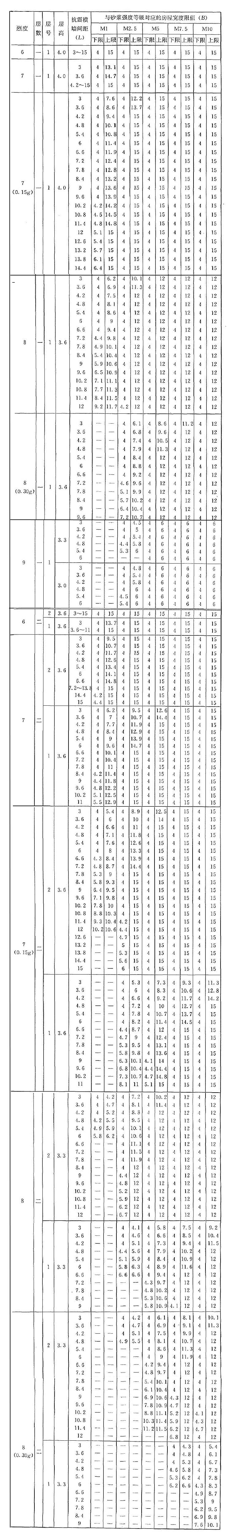 | 烈度 | 層數(shù) | 層號 | 層高 | 抗震橫墻間距(L) | 與砂漿強度等級對應(yīng)的房屋寬度限值(B) | |||||||||