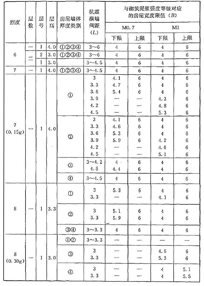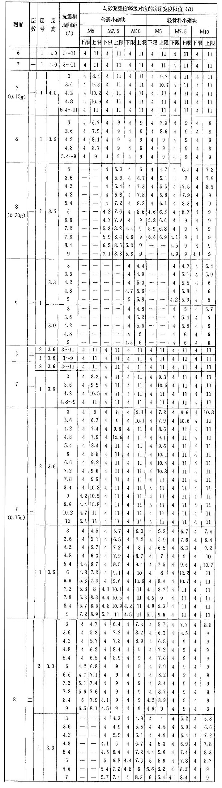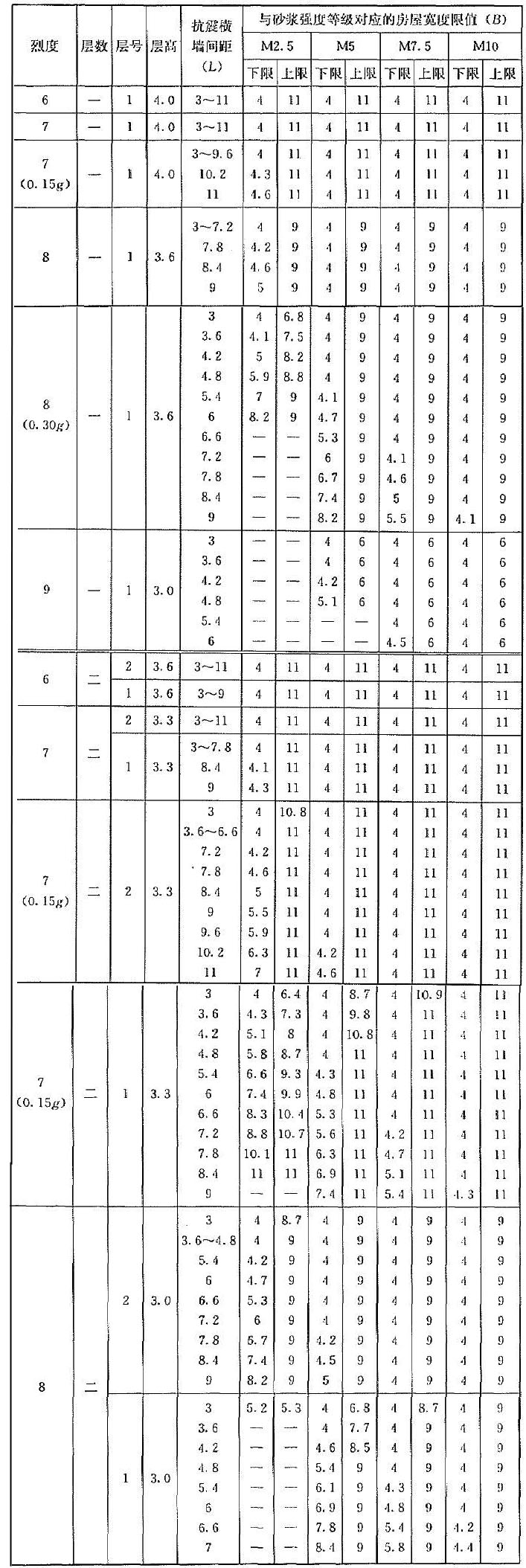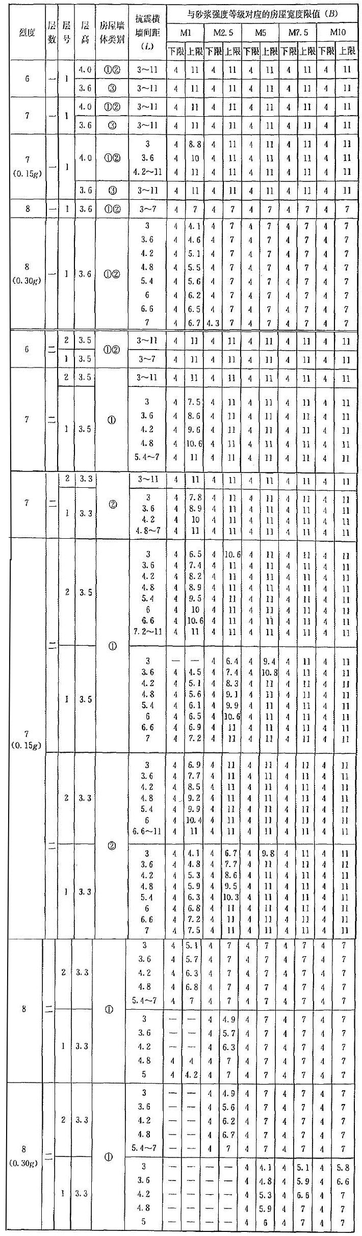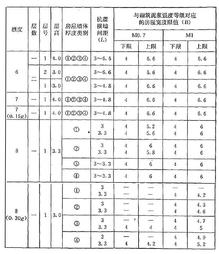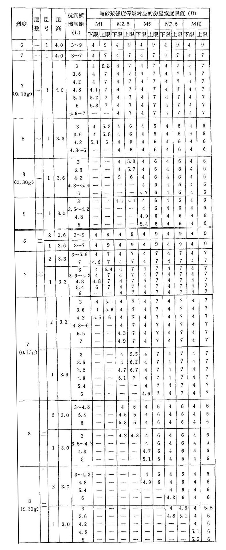 | 烈度 | 層數(shù) | 層號 | 層高 | 抗震橫墻間距(L) | 與砂漿強度等級對應(yīng)的房屋寬度限值(B) | |||||||||
