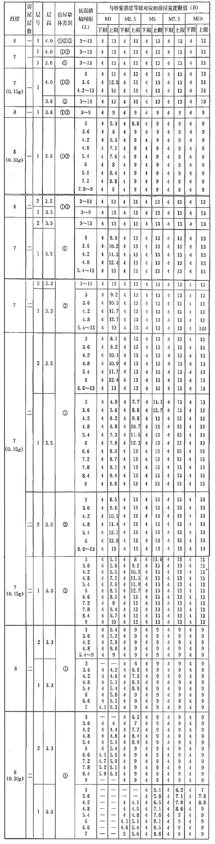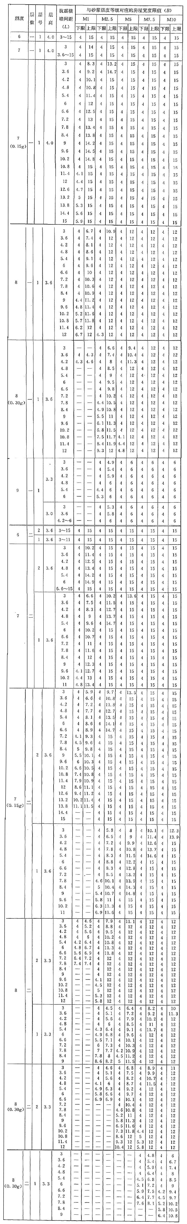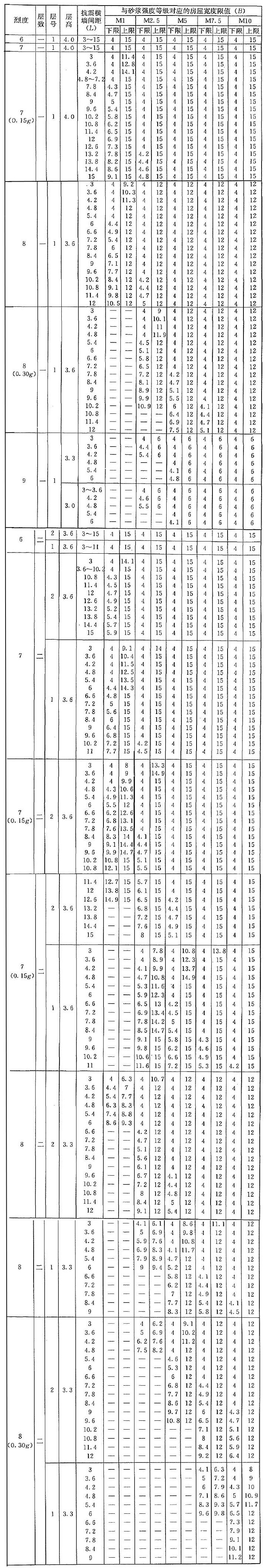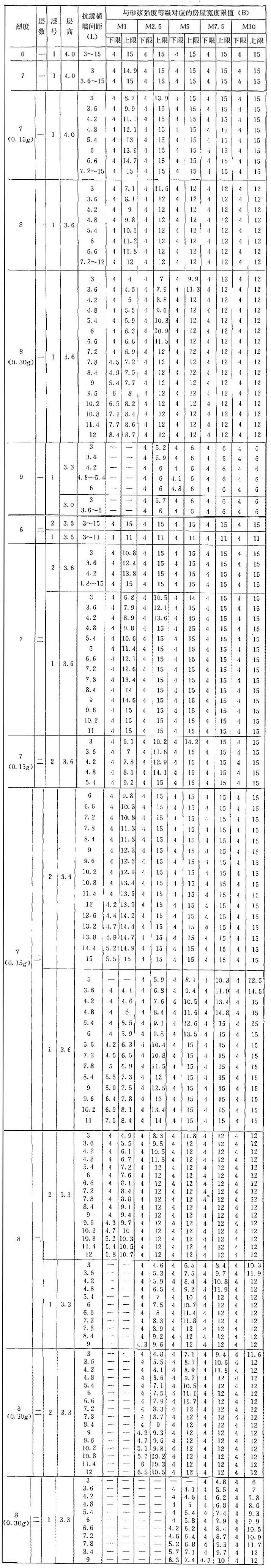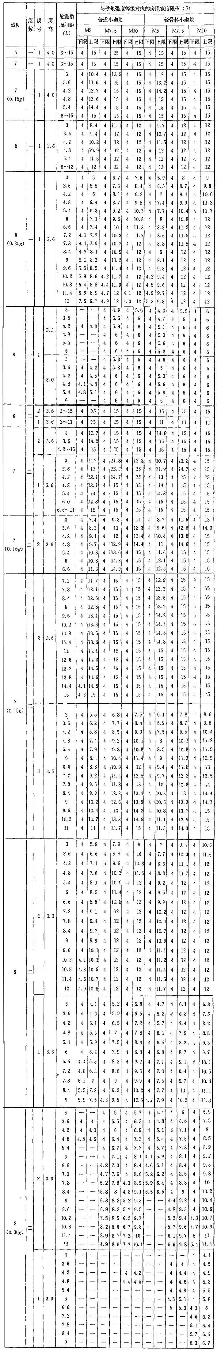 B.0.1 當磚墻厚度滿足本規(guī)程第5.1.8條規(guī)定、墻體洞口水平截面面積滿足本規(guī)程第3.1.2條規(guī)定、層高不大于本附錄下列表中對應(yīng)值時,各類墻體砌體結(jié)構(gòu)房屋的抗震橫墻間距(L)和對應(yīng)的房屋寬度(B)的限值宜分別按表B.0.1-1至表B.0.1-20采用??拐饳M墻間距和對應(yīng)的房屋寬度滿足表中對應(yīng)限值要求時,房屋墻體的抗震承載力可滿足對應(yīng)的設(shè)防烈度地震作用的要求。對表B.0.1-1至表B.0.1-20的采用,應(yīng)符合下列要求: