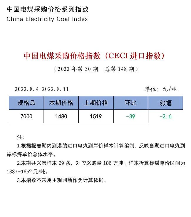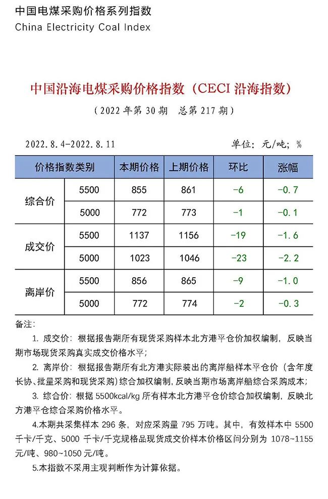 2022年|中國(guó)電煤采購(gòu)價(jià)格CECI系列指數(shù)(2022年8月4日-8月11日)