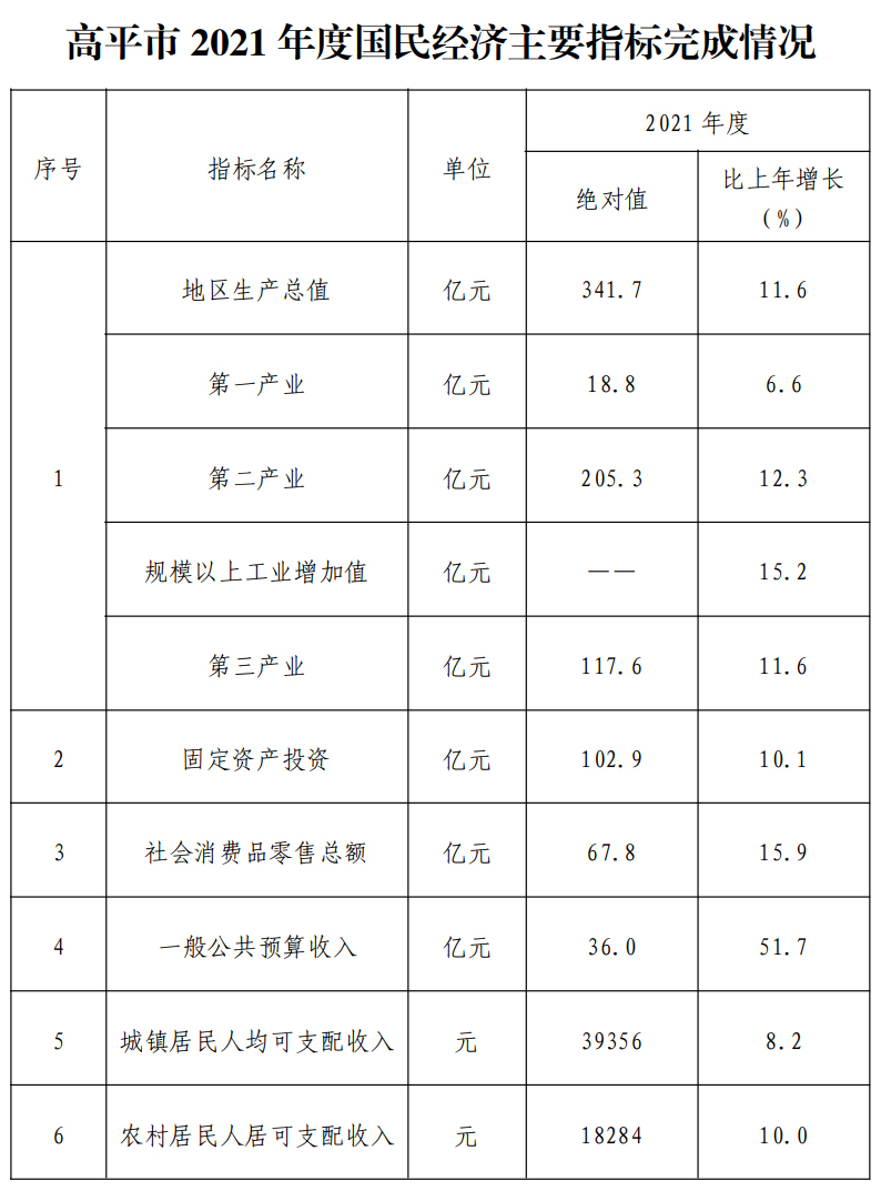 (晉城市)高平市2021年度國(guó)民經(jīng)濟(jì)主要指標(biāo)完成情況