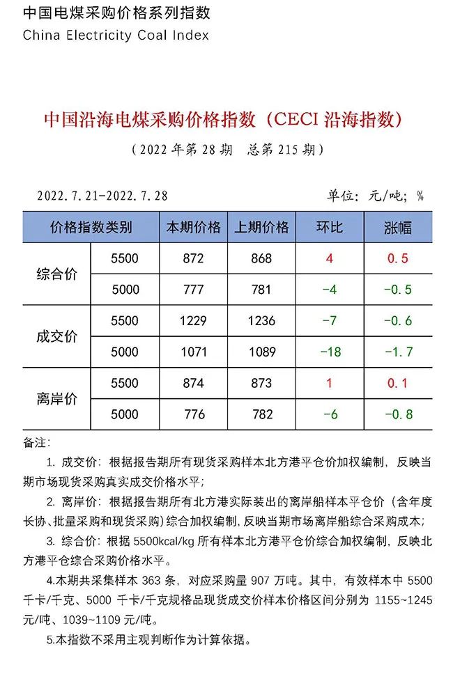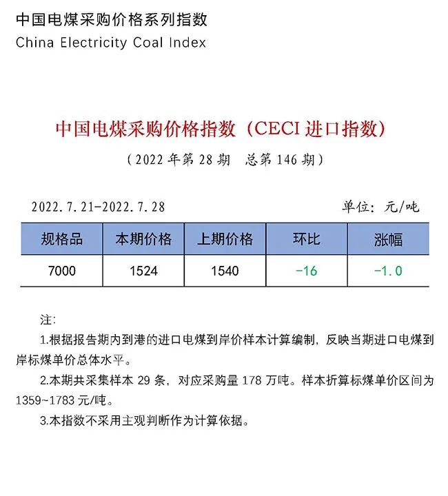 2022年|中國電煤采購價格CECI系列指數(shù)(2022年7月21日-7月28日)