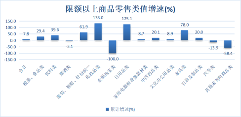 上半年,全旗限額以上商品零售14大類值實現(xiàn)10升4降。增速詳見下圖: