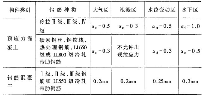 3.0.5 預(yù)應(yīng)力構(gòu)件在作用的頻遇組合(短期效應(yīng)組合)時的混凝土拉應(yīng)力限制系數(shù)αct和鋼筋混凝土構(gòu)件在作用的準永久組合(長期效應(yīng)組合)時的最大裂縫寬度,不得超過表3.0.5規(guī)定的限值。