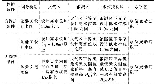 3.0.4 應(yīng)根據(jù)預(yù)定功能和混凝土建筑物部位所處的環(huán)境條件,對混凝土提出不同的防腐蝕要求和措施?;炷敛课豢筛鶕?jù)水域掩護條件和港工設(shè)計水位或天文潮位按表3.0.4的規(guī)定劃分。