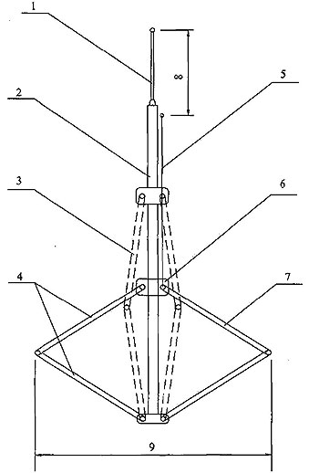 1—主測繩;2—主桿;3—收縮狀態(tài);4—測桿;5—副測繩;6—配重;7—張開狀態(tài);8—落差;9—承力盤腔直徑