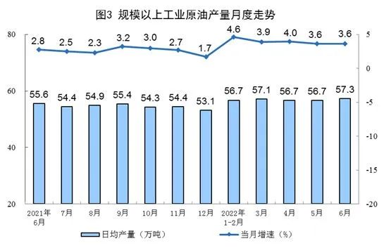 原油生產(chǎn)穩(wěn)定增長(zhǎng),進(jìn)口由升轉(zhuǎn)降。6月份,生產(chǎn)原油1719萬(wàn)噸,同比增長(zhǎng)3.6%,增速與上月持平,日均產(chǎn)量57.3萬(wàn)噸。進(jìn)口原油3582萬(wàn)噸,同比下降10.7%,上月為增長(zhǎng)11.9%。